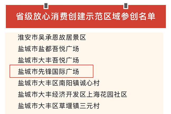 日前,江蘇省放心消費(fèi)創(chuàng)建活動(dòng)辦公室、江蘇省市場(chǎng)監(jiān)管局發(fā)布了2023年度江蘇省級(jí)放心消費(fèi)創(chuàng)建示范單位、示范區(qū)域參創(chuàng)名單,集團(tuán)先鋒國(guó)際廣場(chǎng)成功入選了省級(jí)放心消費(fèi)創(chuàng)建示范區(qū)域參創(chuàng)名單。