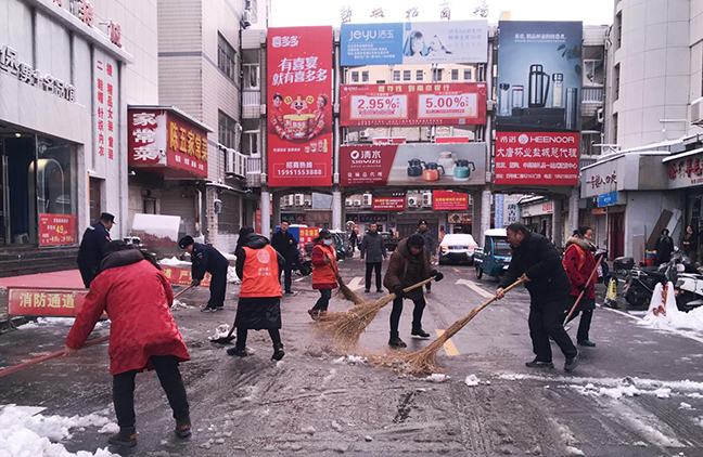 鹽城招商場“聞雪而動”,組織市場管理人員、保潔人員、商戶志愿者到周邊道路、停車場、居民樓坡道開展義務(wù)掃雪活動,并做好宣傳發(fā)動工作,動員市場商戶積極參與到活動中來。大家干勁十足、團結(jié)協(xié)作、有序清理,市場周邊積雪情況得到了極大緩解,及時保障了消費者及來往行人的出行暢通。同時,公司還組織人員赴各號樓逐層檢查,排除冰棱墜落安全隱患,進一步保障人員出入安全。