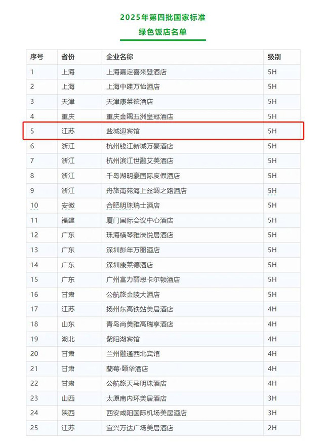 近日,中國(guó)飯店協(xié)會(huì)公布了2025年第四批國(guó)家標(biāo)準(zhǔn)綠色飯店名單,鹽城迎賓館憑借在綠色發(fā)展領(lǐng)域的卓越表現(xiàn)獲評(píng)“五葉級(jí)中國(guó)綠色飯店”稱(chēng)號(hào)。在本次評(píng)選中,成為江蘇省唯一獲此殊榮的酒店,全國(guó)僅16家酒店獲此稱(chēng)號(hào)。