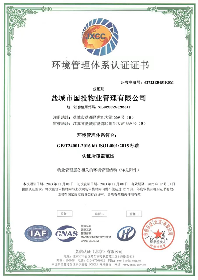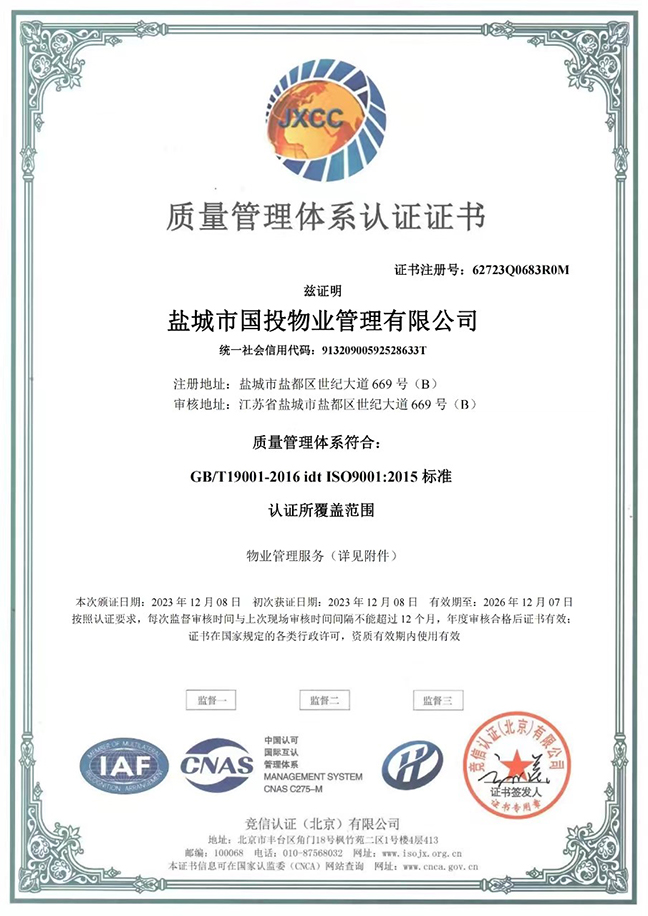 日前,鹽城國(guó)投物業(yè)公司順利取得ISO“三體系”(ISO9001質(zhì)量管理體系、ISO14001環(huán)境管理體系、ISO45001職業(yè)健康安全管理體系)認(rèn)證證書(shū)。這是公司在提升企業(yè)綜合實(shí)力過(guò)程中取得的新進(jìn)展,標(biāo)志著公司在精細(xì)化、制度化、規(guī)范化管理方面邁上新臺(tái)階。