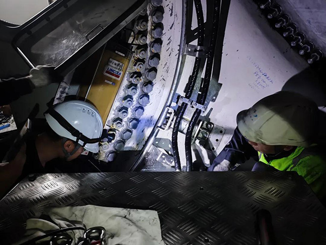 面對復(fù)雜海況,運維團隊同步完成多項關(guān)鍵作業(yè):對#01、#04風機蓄能器支架實施技改以提升設(shè)備穩(wěn)定性;快速處理#19風機偏航液壓站缺陷以恢復(fù)風機運行;在顛簸的船上和高空機艙內(nèi),團隊將“精益運維”落實到每個細節(jié)。