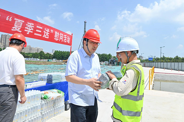 在大數(shù)據(jù)交通指揮中心項(xiàng)目現(xiàn)場(chǎng),張林海與奮戰(zhàn)在高溫一線的施工人員親切交談,關(guān)切詢問防暑降溫、日常工作等情況,對(duì)他們不畏高溫、堅(jiān)守崗位的精神給予充分肯定,并將防暑物資一一送到他們手中,叮囑大家在工作中要做好自我防護(hù)、注意勞逸結(jié)合、保證自身安全。