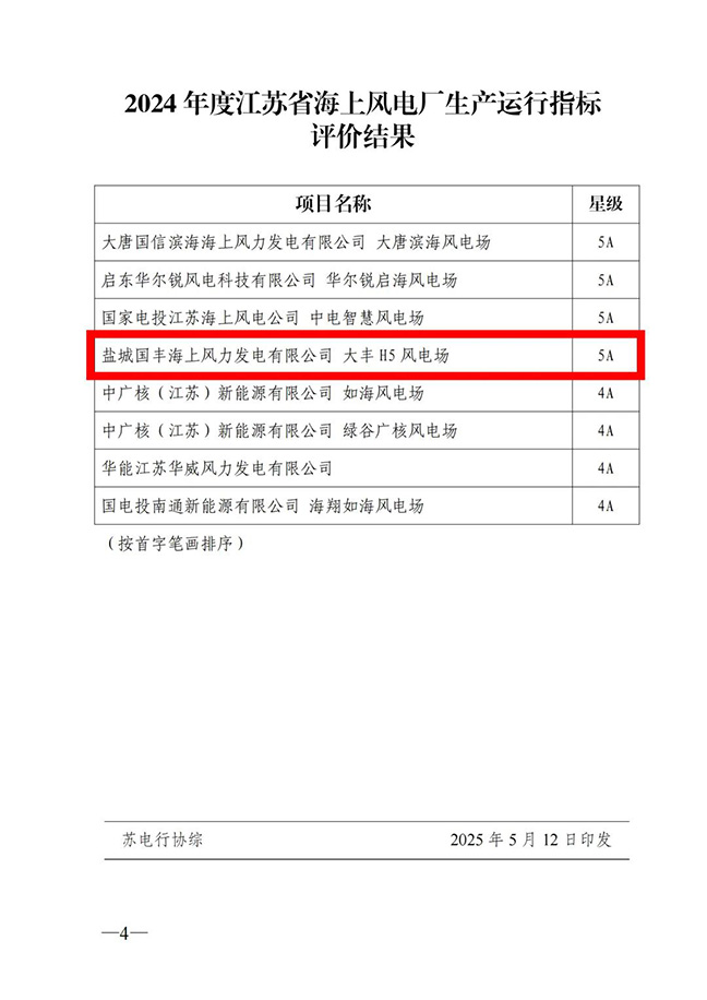 在鹽城綿延的海岸線上,鹽城國(guó)豐海上風(fēng)力發(fā)電有限公司運(yùn)維團(tuán)隊(duì)以專業(yè)與堅(jiān)守,推動(dòng)鹽城國(guó)投集團(tuán)海上風(fēng)電業(yè)務(wù)穩(wěn)步發(fā)展。2024年2月鹽城國(guó)能大豐H5項(xiàng)目單月發(fā)電量達(dá)8118萬(wàn)度,創(chuàng)江蘇省海上風(fēng)電單月發(fā)電量最高紀(jì)錄,11月實(shí)現(xiàn)機(jī)組可利用率達(dá)100%。2025年,該公司憑借卓越的全周期運(yùn)維管理能力和高度協(xié)同的團(tuán)隊(duì)協(xié)作精神,獲評(píng)“江蘇省AAAAA級(jí)海上風(fēng)電場(chǎng)〞稱號(hào)。